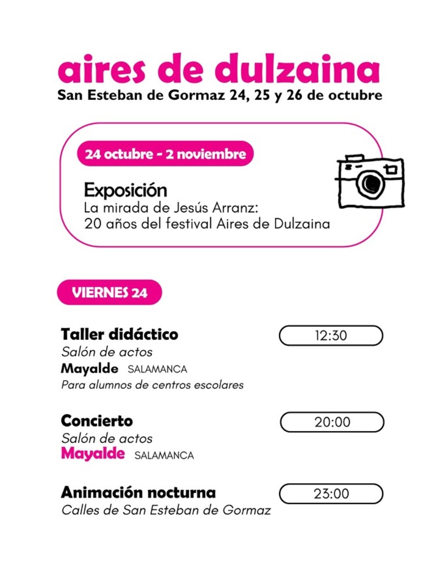 El festival, que mantiene su estructura clásica con viernes escolar, pasacalles, escenarios de escuelas, certamen y conciertos nocturnos, se completa con una exposición homenaje a Jesús Arranz "Jesuso", figura emblemática del festival desde su primera edición desde sus inicios, en 2003, cuyas fotografías narran la historia viva de Aires de Dulzaina y la implicación de músicos, vecinos y voluntariado.